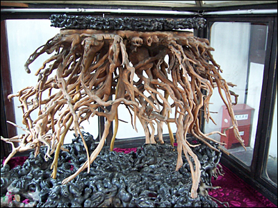 黄杨树枯死之后,主人严慕文很是心疼。也许由于本身具备艺术修养的缘故,当时他就意识到这树根也许可以加工成一件艺术品。于是叫人先截去树干,然后挖掘树根。在挖掘时特别关照,要细心操作,务必使根系丝毫无损。等到全部挖出之后,清理去附着的泥土,细细看过,不觉喜出望外。原来一般树木的根须总是粗细不均,又多枯枝腐条,不堪雕琢,而这株黄杨却与众不同。由于天井下面是积年的瓦砾堆,土质疏松,所以根系得以自由生长,分枝既多又细又匀,最适于雕刻,真是绝无仅有的天然好材料。虽然孔夫子说过“朽木不可雕也”,但此千年难得之根,既未腐朽,自然可雕。严慕文不禁发了艺术狂,他下定决心,要运用奇思妙想,将这树根雕刻琢磨,造就成一件艺术珍品,作为传家传世之物。
