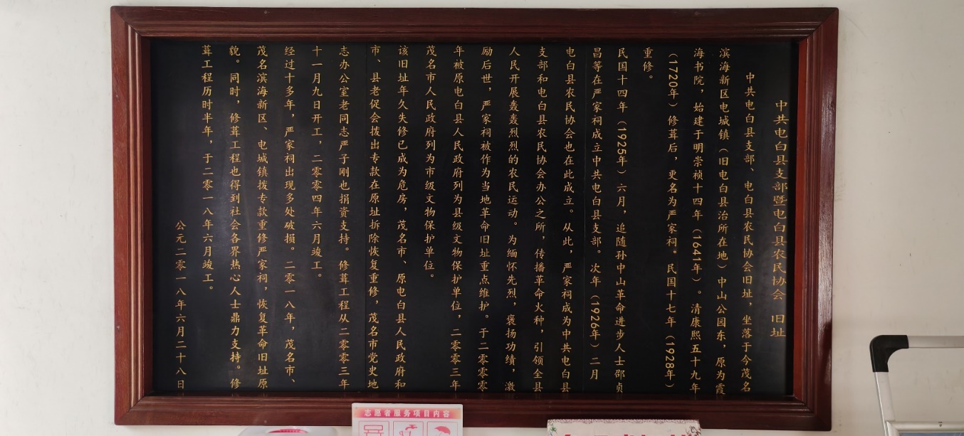 严家祠坐落于电城人民公园与中心小学之间,原为霞海书院,始建于明崇祯十四年(1641年)。清康熙五十九年(1720年)修葺后,更名为“严家祠”。1925年6月,邵贞昌等人在此成立中共南路第一个党支部——中共电白县支部。民国十七年(1928年)再次重修。2000年公布为县级文物保护单位,2003年升为市级文物保护单位。