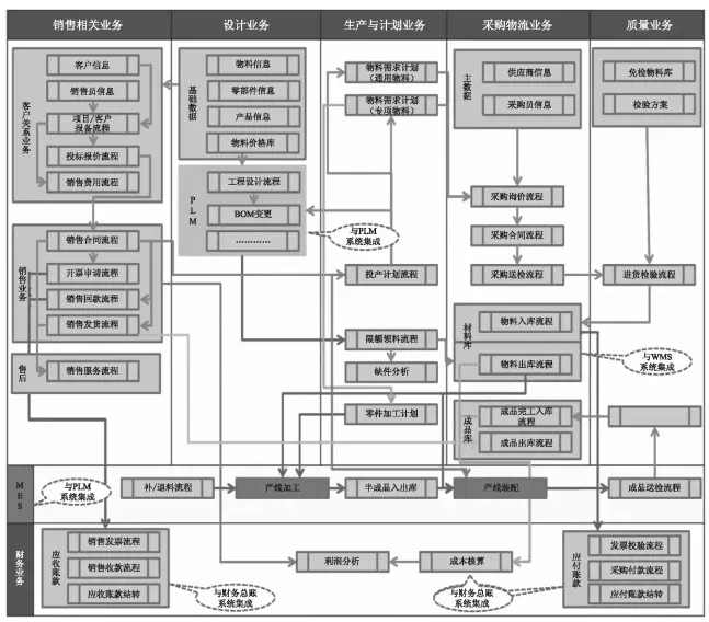(2)PLM(产品生命周期管理系统):它负责产品设计的图文档、设计过程、设计变更、工程配置的管理,为ERP系统提供最主要的数据源BOM表,同时为MES系统提供最主要的数据源工艺路线文件。