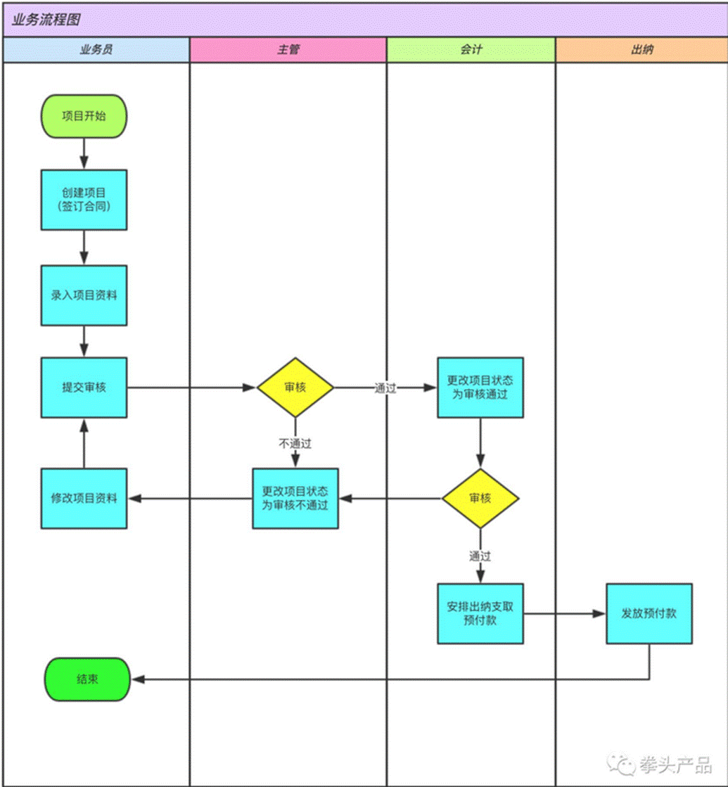 通过业务流程图,可以在大方向上知道产品的整体逻辑,业务流程图拆解可以得到任务流程图,任务流程图拆解可以得到页面流程图。