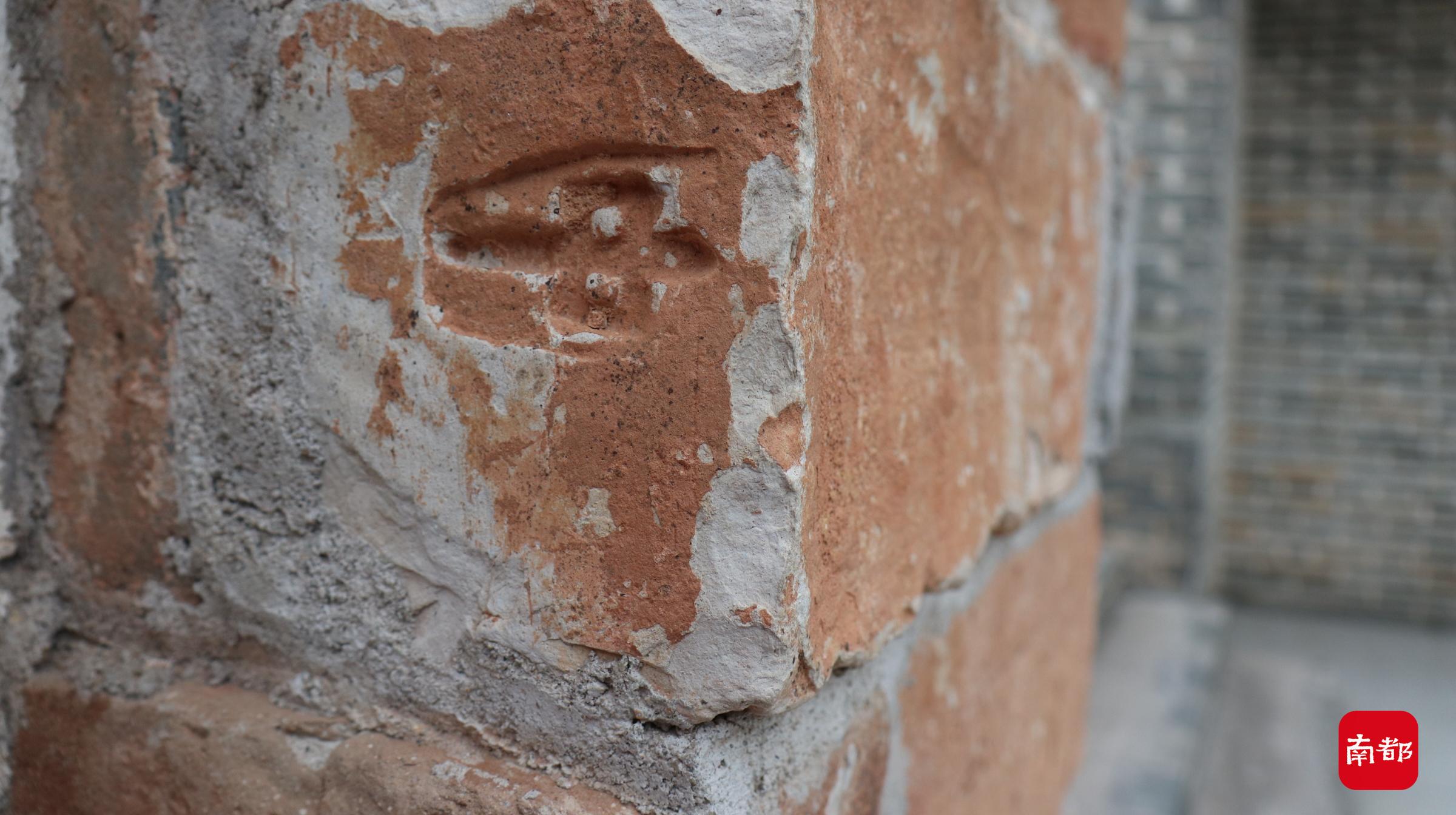 中心小学操场边有两根由城墙砖砌成的石柱,图为“中”字款城墙砖。